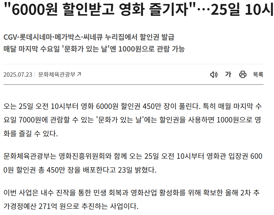 문화체육관광부(문체부)가 영화관람료 6천 원을 지원하는 ‘2025 영화할인권 정책’을 본격 시행합니다.