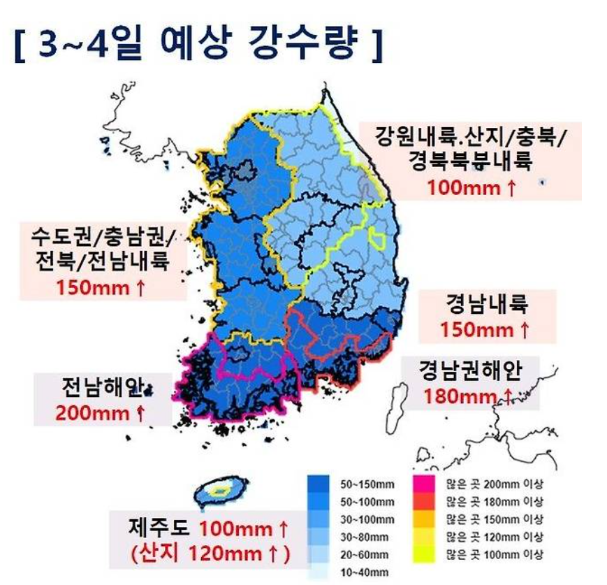 기상청은 8월 3일부터 4일까지 수도권을 중심으로 150mm 이상의 강수량이 예상된다고 발표했습니다.